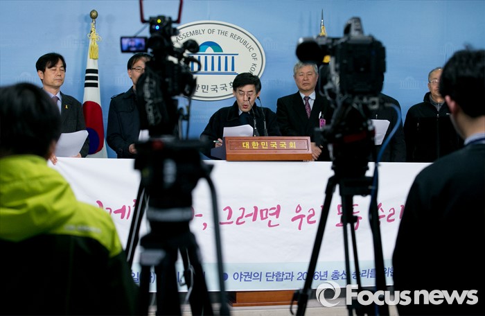 (서울=포커스뉴스) 8일 오전 서울 여의도 국회 정론관에서 야권의 단합과 2016년 총선 승리를 위한 수도권연대 회원들이 발족 및 야권 단일화를 촉구하는 기자회견을 하고 있다.