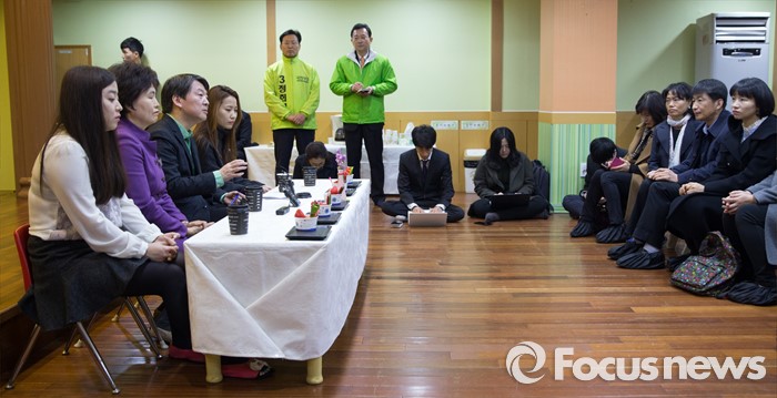 (서울=포커스뉴스) 노원병 출마 선언 기자회견을 마친 안철수 국민의당 상임공동대표가 8일 오전 서울 노원구 동일로의 한 유치원에서 학부모 간담회를 하고 있다.