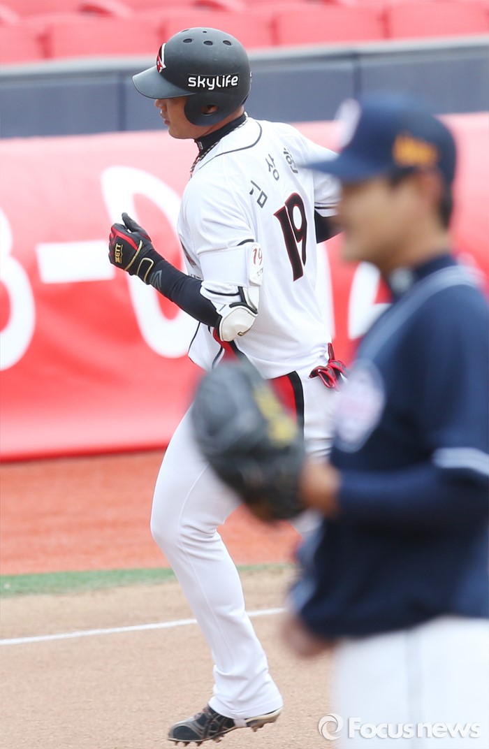 (수원=포커스뉴스) 8일 수원 kt위즈파크에서 열린 2016 KBO리그 시범경기 두산-kt 경기에서 1회말 2사 1루에서 kt 김상현이 중월2점 홈런을 날리고 3루를 돌고 있다.