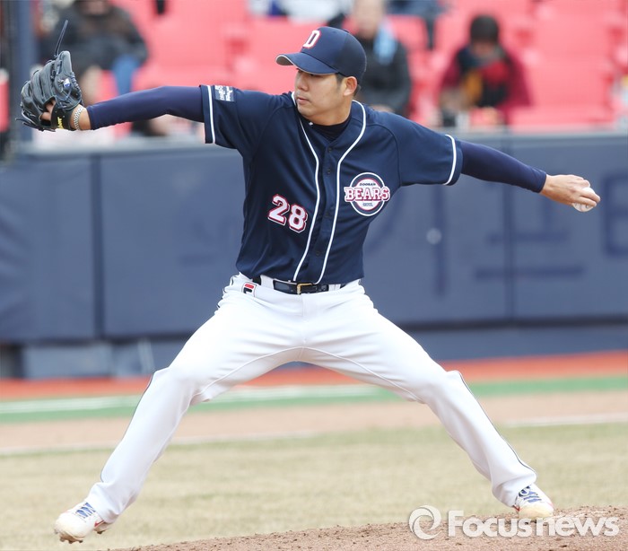 (수원=포커스뉴스) 8일 수원 kt위즈파크에서 열린 2016 KBO리그 시범경기 두산-kt 경기에서 두산 장원준이 4회 두번째 투수로 등판해 투구하고 있다.