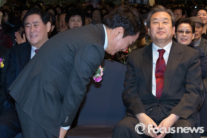 (서울=포커스뉴스) 김무성(오른쪽) 새누리당 대표와 최경환 새누리당 의원이 8일 오후 서울 마포구 신촌 케이터틀 컨벤션홀에서 열린 새누리당 서울시당 서대문갑 당원교육 및 전진대회에 참석해 자리에 앉아 있고 이성헌 예비후보는 인사를 하고 있다.
