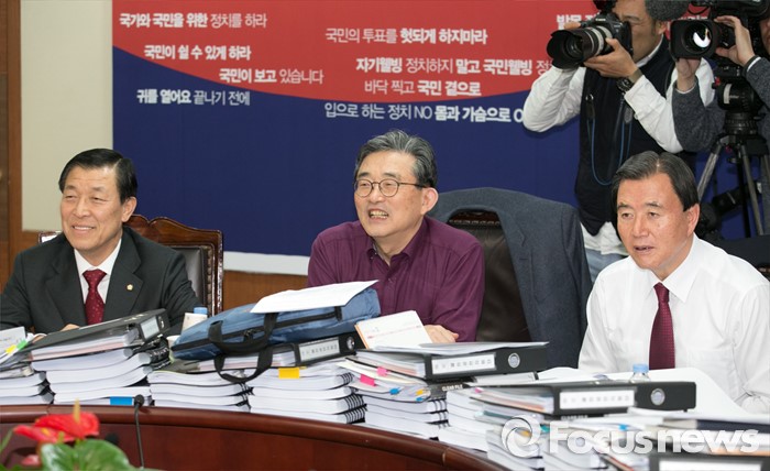 (서울=포커스뉴스) 8일 오후 서울 여의도 새누리당사에서 열린 20대 총선 분구·통합·경계조정 지역구 공천신청자 면접에 이한구 공천관리위원장이 예비후보들에게 질문하고 있다. 왼쪽부터 황진하 부위원장, 이 위원장, 홍문표 위원.