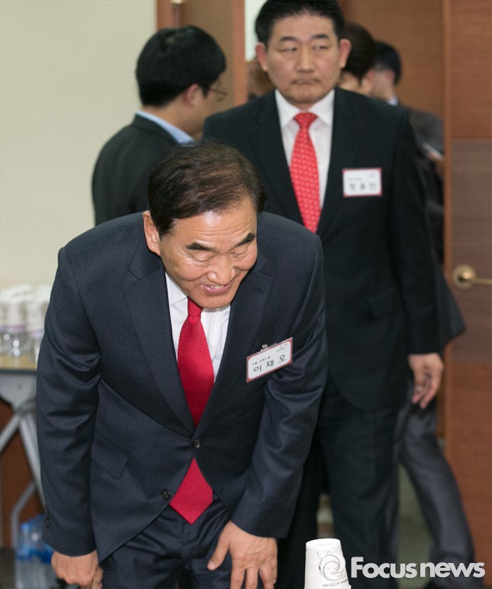 (서울=포커스뉴스) 8일 오후 서울 여의도 새누리당사에서 열린 20대 총선 분구·통합·경계조정 지역구 공천신청자 면접에 서울 은평을에 신청한 이재오 의원이 참석하며 인사하고 있다.