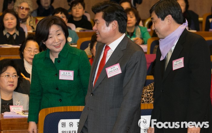 (서울=포커스뉴스) 8일 오후 서울 여의도 국회 헌정기념관에서 열린 세계 여성의 날 기념대회에 참석한 원유철(가운데) 새누리당 원내대표, 이종걸(오른쪽) 더불어민주당 원내대표가 먼저 퇴장하는 심상정 정의당 상임대표와 대화하고 있다.