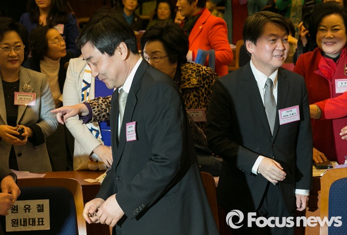 (서울=포커스뉴스) 8일 오후 서울 여의도 국회 헌정기념관에서 열린 세계 여성의 날 기념대회에 참석한 이종걸(왼쪽) 더불어민주당 원내대표와 안철수 국민의당 상임공동대표가 각각 참석자들과 인사하고 있다.