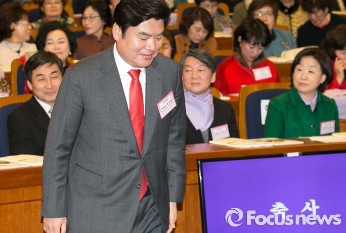 (서울=포커스뉴스) 8일 오후 서울 여의도 국회 헌정기념관에서 열린 세계 여성의 날 기념대회에 참석한 원유철 새누리당 원내대표가 축사를 위해 단상으로 향하고 있다. 왼쪽부터 이종걸 더불어민주당 원내대표, 원 원내대표, 안철수 국민의당 상임공동대표, 심상정 정의당 상임대표.