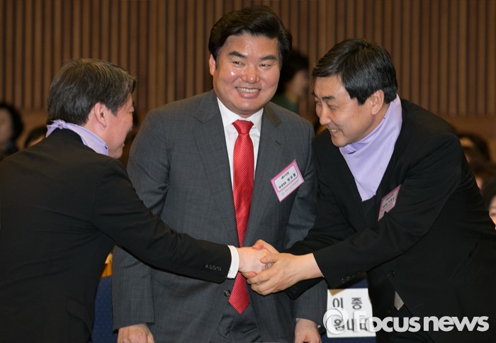 (서울=포커스뉴스) 8일 오후 서울 여의도 국회 헌정기념관에서 열린 세계 여성의 날 기념대회에 참석한 이종걸(오른쪽) 더불어민주당 원내대표가 축사를 마친 안철수(왼쪽) 국민의당 상임공동대표와 악수하고 있다. 가운데는 원유철 새누리당 원내대표.