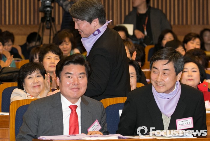 (서울=포커스뉴스) 8일 오후 서울 여의도 국회 헌정기념관에서 열린 세계 여성의 날 기념대회에 참석한 안철수 국민의당 상임공동대표가 축사를 위해 단상으로 향하고 있다. 왼쪽부터 원유철 새누리당 원내대표, 안 상임공동대표, 이종걸 더불어민주당 원내대표.