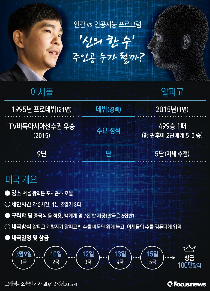 (서울=포커스뉴스)강력한 학습능력으로 무장한 구글 인공지능 바둑 프로그램 '알파고'(AlphaGo)와 세계 최강의 바둑기사 이세돌(33) 9단의 대국이 서울 포시즌스 호텔에서 9~15일까지(11일, 14일 제외) 총 5판으로 진행된다.