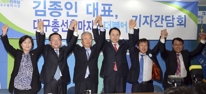 (서울=포커스뉴스) 8일 오전 대구 동구 더불어민주당 대구시당에서 기자간담회를 마친 김종인 비대위 대표와참석자들이 총선 승리를 다짐하며 취재진을 향해 포즈를 취하고 있다. 왼쪽부터 김혜정 대구시의원, 김부겸 수성갑 예비후보, 김 대표, 조기석 대구시당 위원장, 김동열 중·남구 예비후보, 정기철 수성을 예비후보. <사진제공=더불어민주당>