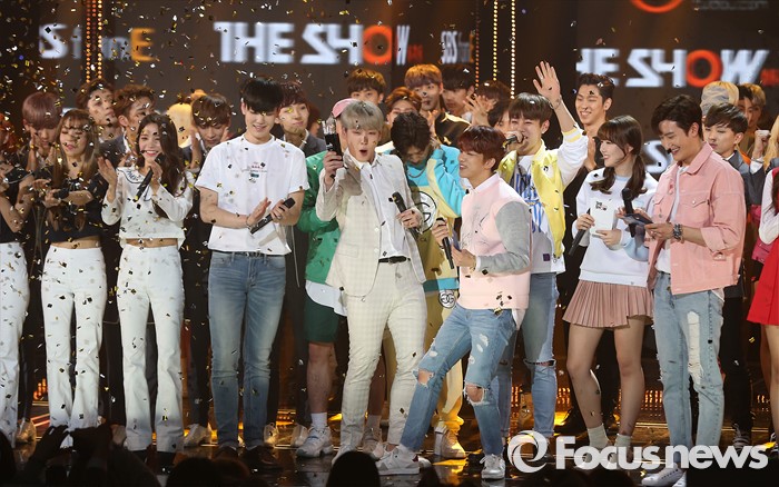 (서울=포커스뉴스) 8일 오후 서울 마포구 SBS프리즘 타워에서 열린 '2016 더쇼 62회' 생방송 촬영 현장에 아이돌 그룹 B.A.P 의 멤버들이 더쇼 초이스에 선정돼자 환호 하고 있다.