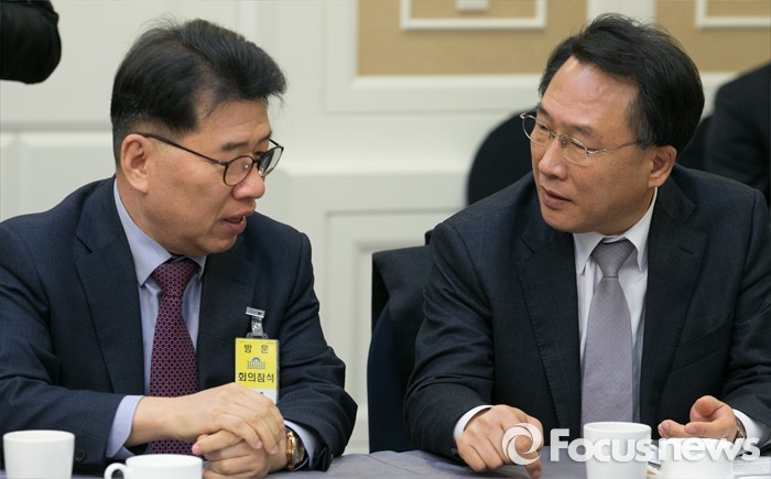 (서울=포커스뉴스) 9일 오전 서울 여의도 국회 귀빈식당에서 경제활성화를 위한 민·당·정 간담회에 앞서 방하남(오른쪽) 한국노동연구원장과 반원익 중기연합회 상근부회장이 대화하고 있다.