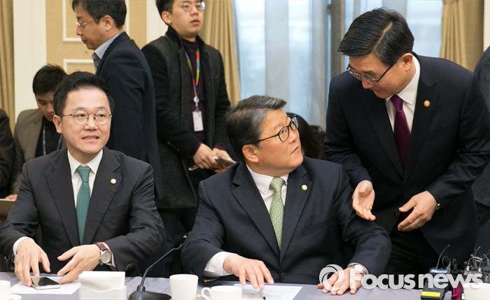 (서울=포커스뉴스) 9일 오전 서울 여의도 국회 귀빈식당에서 경제활성화를 위한 민·당·정 간담회에 앞서 이기권(오른쪽) 고용노동부 장관과 조원진(가운데) 새누리당 원내수석부대표가 인사하고 있다. 왼쪽은 강석훈 의원.