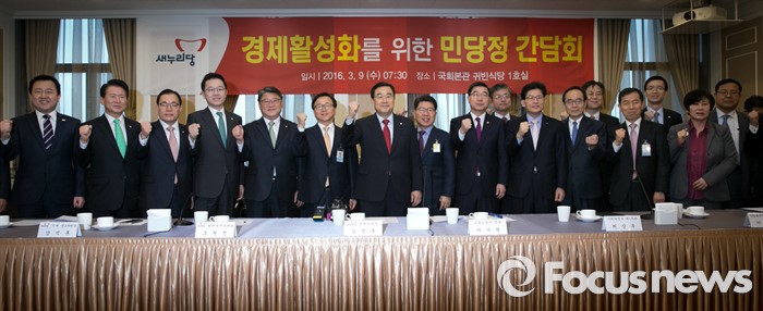 (서울=포커스뉴스) 9일 오전 서울 여의도 국회 귀빈식당에서 경제활성화를 위한 민·당·정 간담회에 앞서 참석자들이 파이팅을 외치며 취재진을 향해 포즈를 취하고 있다. 왼쪽부터 김용남, 김한표, 이채익, 강석훈 새누리당 의원, 조원진 원내수석부대표, 이동근 대한상의 상근부회장, 김정훈 새누리당 정책위의장, 반원익 중기연합회 상근부회장, 이기권 고용노동부 장관, 최상목 기획재정부 1차관, 송재희 중소기업중앙회 상근부회장, 김준경 한국개발연구원장, 이관섭 산업통상자원부 1차관, 김도훈 산업연구원장, 방문규 보건복지부 차관, 황정애 대한은퇴자협회장, 김영배 한국경영자총협회 상임부회장.