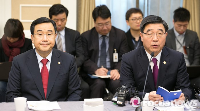 (서울=포커스뉴스) 9일 오전 서울 여의도 국회 귀빈식당에서 열린 경제활성화를 위한 민·당·정 간담회에 참석한 이기권 고용노동부 장관이 발언하고 있다. 왼쪽은 김정훈 새누리당 정책위의장.