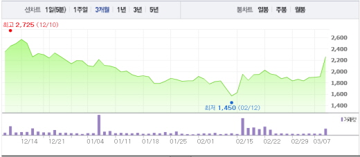 9일 오전 9시15분 쌍방울은 전날보다 17.80%(340원) 오른 2250원에 거래되고 있다.