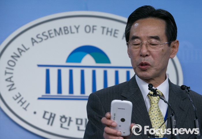 (서울=포커스뉴스) 홍창선 더불어민주당 공천관리위원장이 9일 오전 서울 여의도 국회 정론관에서 20대 총선 1차 경선지역과 관련 브리핑 중 "먼저 문자를 보낸 취재진에게 선물을 주겠다"며 핸드폰을 확인하고 있다. 홍 위원장은 이날 브리핑 중 취재관행을 바꾸기 위한 언론인과 대화를 하던 중 일부 항의를 받았다.