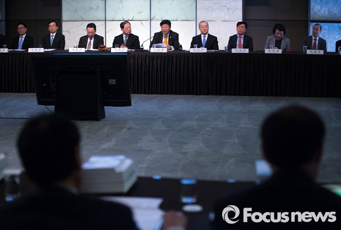 (서울=포커스뉴스) 주형환(왼쪽 다섯번째) 산업통상자원부 장관이 9일 오전 서울 중구 플라자호텔에서 열린 '2016 경제단체협의회 정기총회'에 참석, 축사를 하고 있다.