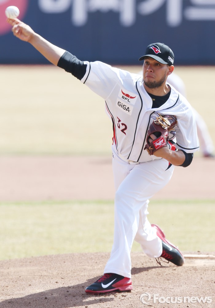 (수원=포커스뉴스) 9일 수원 kt위즈파크에서 열린 2016 KBO리그 시범경기 두산-kt 경기에서 1회초 kt 새 외국인 투수 피노가 투구하고 있다.