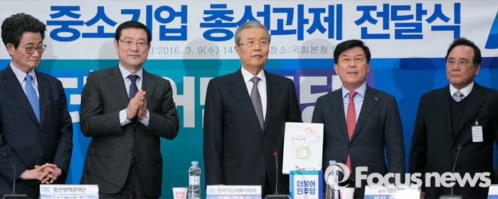 (서울=포커스뉴스) 김종인(왼쪽 세번째) 더불어민주당 비대위 대표가 9일 오후 서울 여의도 국회에서 열린 중소기업중앙회 회장단 총선과제 전달식에 참석해 박성택(오른쪽 두번째) 중소기업중앙회장으로부터 과제를 전달받은 뒤 취재진을 향해 포즈를 취하고 있다.