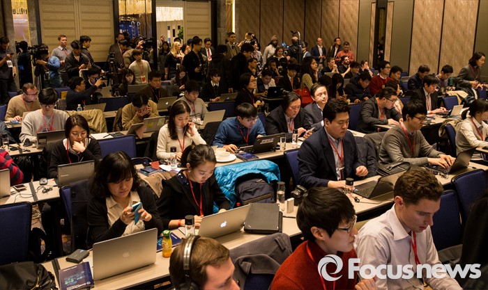 (서울=포커스뉴스) 9일 오후 서울 종로구 포시즌스 호텔에서 열린 이세돌 9단과 알파고의 '구글 딥마인드 챌린지 매치'에 참석한 취재진이 대국을 관전하고 있다.