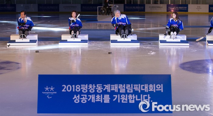 (춘천=포커스뉴스) 9일 오후 강원 춘천의암빙상장에서 제2회 2018 평창 패럴림픽 데이에 참석한 김연아(오른쪽부터) 평창동계올림픽 홍보대사, 조양호 평창동계올림픽 조직위원장, 나경원 국제장애인올림픽위원회(IPC) 집행위원, 최문순 강원도지사가 패럴림픽 성공을 기원하며 아이스슬레지하키 시타를 하고 있다.