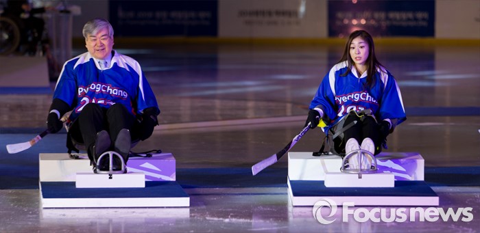 (춘천=포커스뉴스) 9일 오후 강원 춘천의암빙상장에서 제2회 2018 평창 패럴림픽 데이에 참석한 조양호(왼쪽) 평창동계올림픽 조직위원장과 홍보대사 김연아가 아이스슬레지하키 시타를 하고 있다.