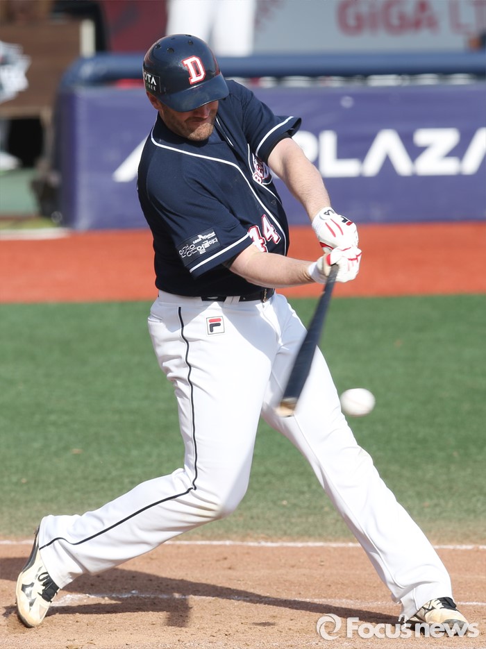 (수원=포커스뉴스) 9일 수원 kt위즈파크에서 열린 2016 KBO리그 시범경기 두산-kt 경기에서 9회초 무사 2루에서 두산 에반스가 타격하고 있다.