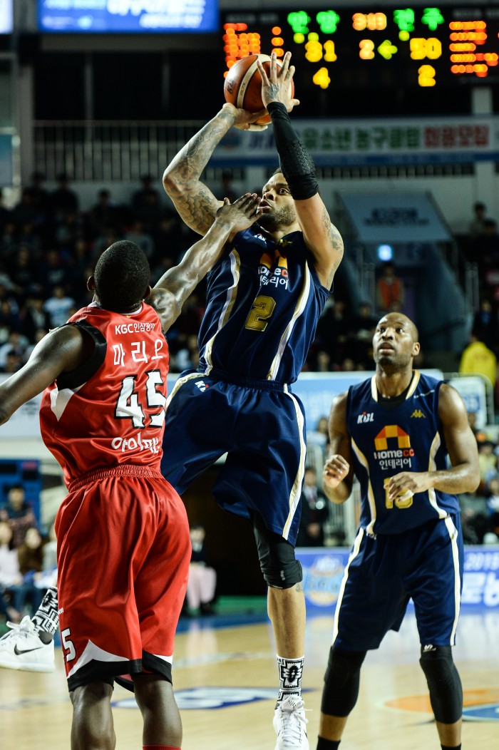 KGC는 3점슛 12개를 몰아치며 1차전보다 득점력을 끌어올렸다. 후반 조금씩 격차를 좁혀갔다. 하지만 외국인선수 찰스 로드(11득점 11리바운드)가 3쿼터 종료 1분6초 전 5반칙 퇴장당한 데 이어 마리오 리틀(28득점 9어시스트)까지 4쿼터 5반칙 퇴장되면서 따라갈 힘을 잃었다. 오세근이 21득점 11리바운드로 분전했지만 패배를 막기에는 역부족이었다.남자프로농구 KCC 외국인선수 안드레 에밋이 9일 전주실내체육관에서 열린 KGC와의 4강 플레이오프 2차전에서 상대 마리오 리틀의 수비를 피해 점프슛을 하고 있다. <사진제공=프로농구연맹>