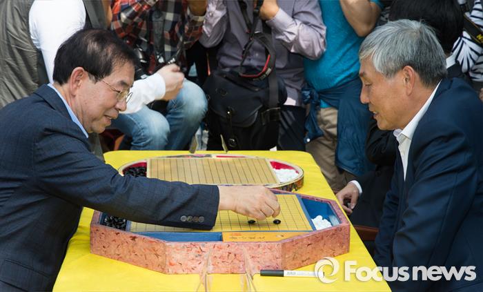 앞서 원 원내대표는 이세돌 9단과 구글이 만든 인공지능 알파고(AlphaGo)의 첫 대국이 실시된 9일 "이세돌 9단의 첫 수는 인류가 새로운 도전을 하는 역사적인 수가 될 것"이라며 "대한민국의 바둑이 세계적인 한류로 발돋움하는 역사적인 날"이라고 말한 바 있다.박원순(왼쪽) 시장과 조훈현 9단이 20일 오전 서울 세종대로에서 열린 '2015 서울 차 없는 날- 1000인의 바둑 다면기' 행사에 참석해 바둑을 두고 있다. 2015.09.20 오장환 기자