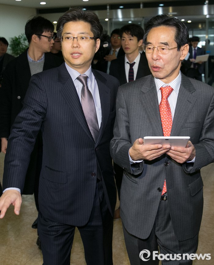 (서울=포커스뉴스) 홍창선(오른쪽) 더불어민주당 공천관리위원장이 10일 오전 서울 여의도 국회 정론관에서 20대 총선 경선 및 단수지역과 2차 공천배제(컷오프) 명단 발표를 마친 뒤 퇴장하고 있다.