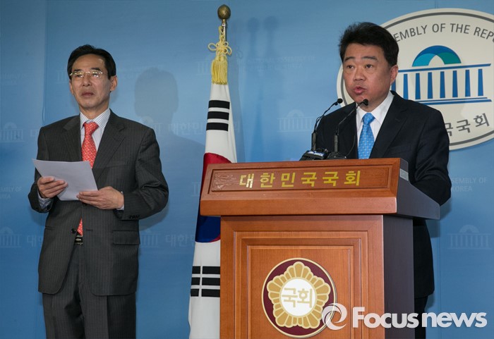 (서울=포커스뉴스) 홍창선(왼쪽) 더불어민주당 공천관리위원장과 김성수 대변인이 10일 오전 서울 여의도 국회 정론관에서 20대 총선 경선 및 단수지역과 2차 공천배제(컷오프) 명단 발표를 하고 있다.