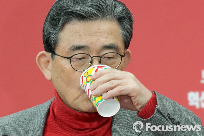 (서울=포커스뉴스) 이한구 새누리당 공천관리위원장이 10일 오전 서울 여의도 당사에서 2차 공천 결과 발표 중, 물을 마시고 있다.