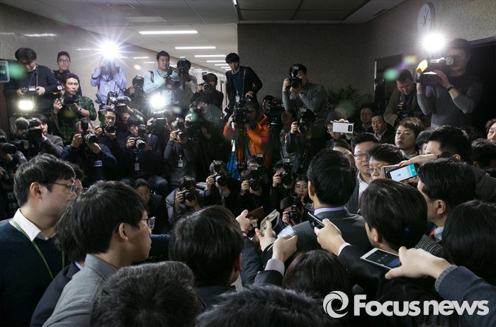 (서울=포커스뉴스) '김무성 욕설 녹취록'으로 논란을 일으킨 윤상현 새누리당 의원이 10일 오전 서울 여의도 국회에서 비공개 최고위원회의에 참석한 뒤 취재진 질문에 답하고 있다. 전날 김무성 대표와의 면담이 불발된 윤 의원은 이날 오전 김 대표의 자택을 방문해 사과했다고 전했다.