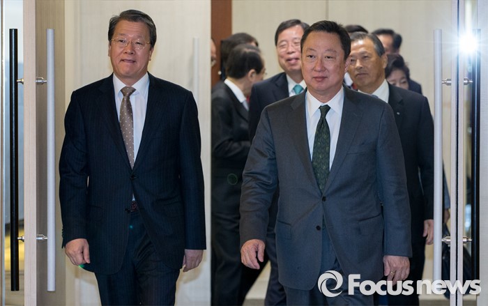 (서울=포커스뉴스) 10일 오전 서울 중구 대한상공회의소에서 열린 국세청장 초청 전국상의 회장단 정책간담회에 참석한 임환수 국세청장(앞줄 왼쪽부터), 박용만 대한상의 회장이 간담회장으로 발걸음을 옮기고 있다.