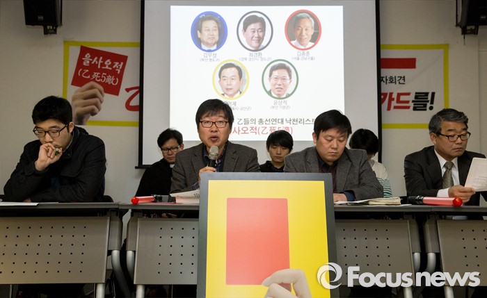(서울=포커스뉴스) 10일 오전 서울 종로구 참여연대에서 을(乙)총선연대, 참여연대를 비롯한 시민단체 회원들이 '경제민주화 을(乙)들의 총선연대 집중 낙천리스트 발표 기자회견'을 하고 있다.