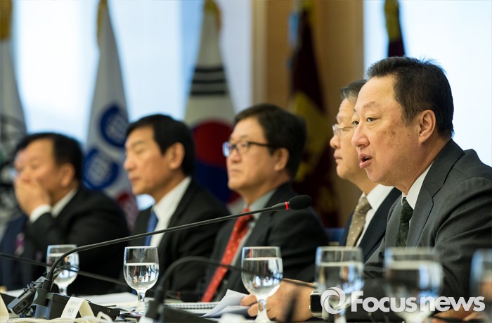 (서울=포커스뉴스) 10일 오전 서울 중구 대한상공회의소에서 열린 국세청장 초청 전국상의 회장단 정책간담회에 참석한 박용만 대한상의 회장이 인사말을 하고 있다.
