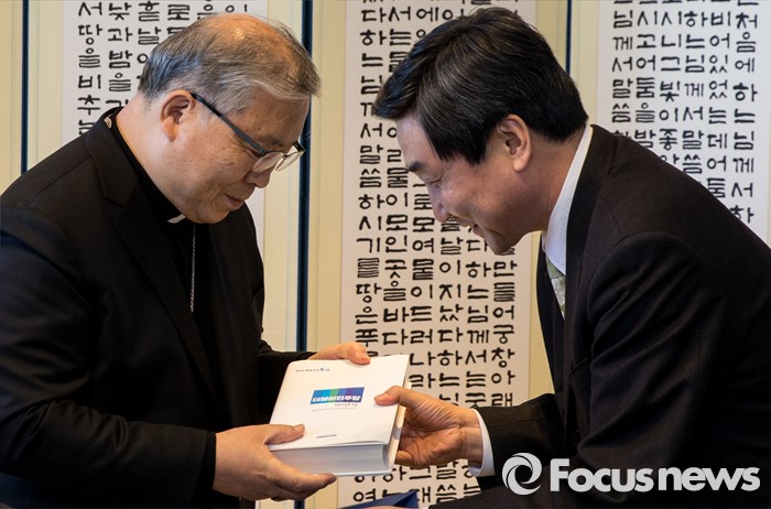 (서울=포커스뉴스) 10일 오후 서울 중구 명동성당에서 장발장법 통과에 대한 감사패를받은이종걸(오른쪽) 더불어민주당 원내대표가 염수정 추기경에게 더민주 60년사 책자를 전달하고 있다.