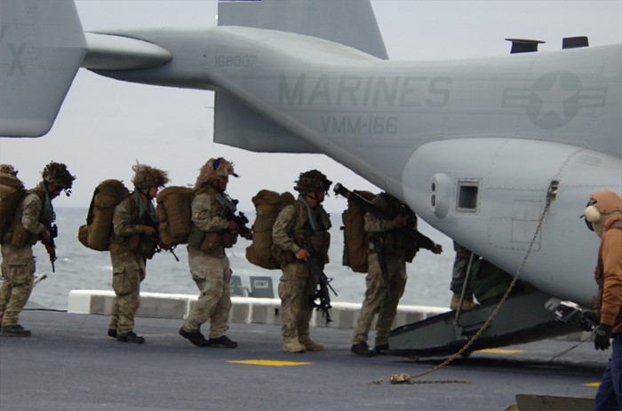 (서울=포커스뉴스) 2016년 쌍룡훈련에 참가한 뉴질랜드 육군 장병들이 지난 9일 독도함에서 미 해병대 MV-22 오스프리를 이용한 공중돌격훈련을 하고 있다. <사진제공=해군>