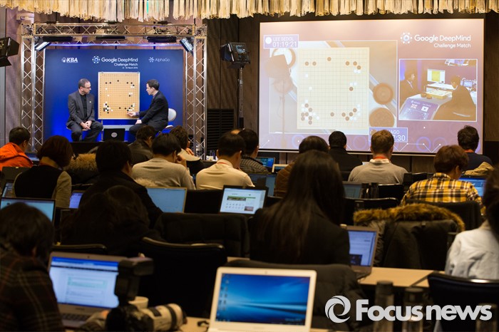 (서울=포커스뉴스) 10일 오후 서울 종로구 포시즌스호텔 기자실에서 크리스 갈록(왼쪽)과 마이클 레드먼드 외국 해설진이 이세돌 9단과 구글 인공지능 알파고의 '구글 딥마인드 챌린지 매치' 2차 대국을 해설하고 있다.