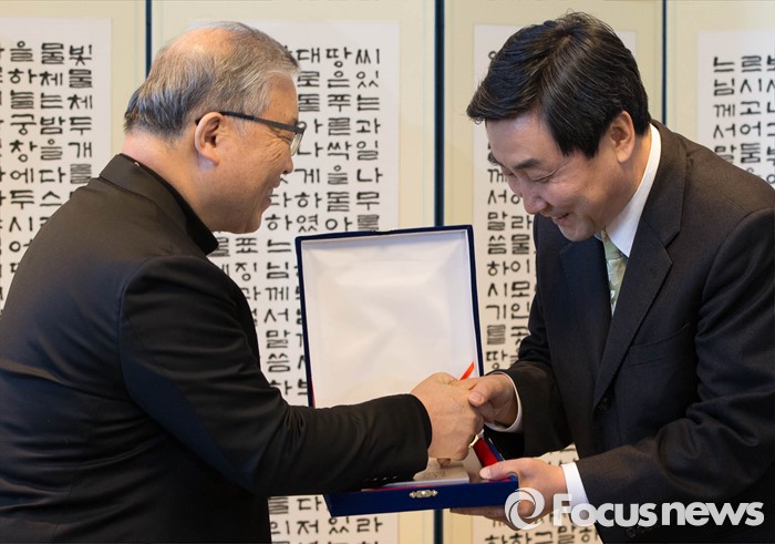 (서울=포커스뉴스) 10일 오후 서울 중구 명동성당에서 이종걸(오른쪽) 더불어민주당 원내대표가 염주성 추기경으로부터 장발장법 통과에 대한 감사패를 전달받고 있다.