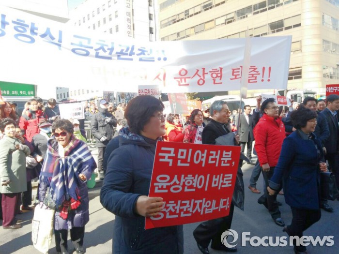 이들은 '밀실공천 타파하고 국민공천 지켜내자' '상향식 공천제 실시하자' '국민여러분, 윤상현이 바로 공천권자입니다' '막말 정치인 퇴출!' 등이 적힌 피켓을 들고 1시간여 동안 시위를 했다.