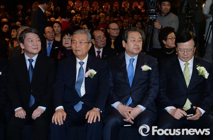 (서울=포커스뉴스) 정의화 국회의장과 정당 대표들이 10일 오후 서울 종로구 세종문화회관 세종홀에서 열린 김종필 전 국무총리의 정치인생을 담은 '김종필 증언록' 출판기념회에 참석해 자리하고 있다. 오른쪽부터 정 의장, 김무성 새누리당 대표, 김종인 더불어민주당 비대위 대표, 안철수 국민의당 상임공동대표.