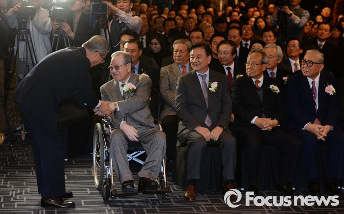 (서울=포커스뉴스) 김종필(오른쪽 네번째) 전 국무총리가 10일 오후 서울 종로구 세종문화회관 세종홀에서 열린 자신의 정치인생을 담은 '김종필 증언록' 출판기념회에 참석해 김종인(왼쪽 첫번째) 더불어민주당 비대위 대표와 인사하고 있다.