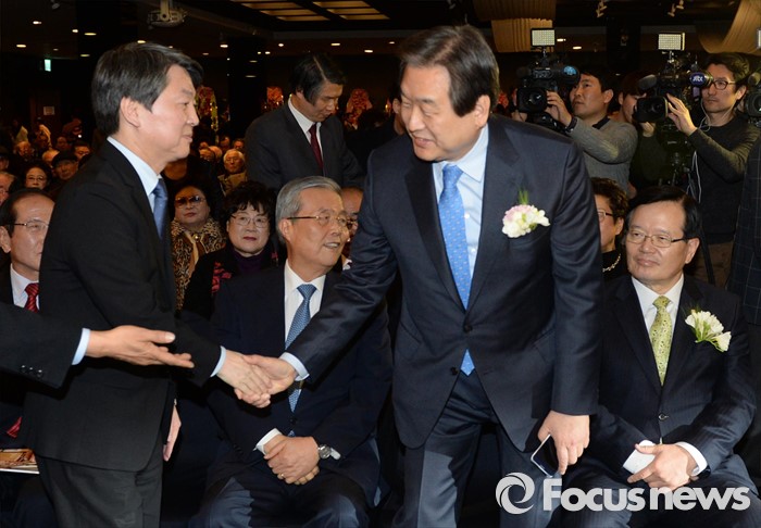 (서울=포커스뉴스) 김무성 새누리당 대표와 안철수 국민의당 상임공동대표가 10일 오후 서울 종로구 세종문화회관 세종홀에서 열린 김종필 전 국무총리의 정치인생을 담은 '김종필 증언록' 출판기념회에 참석해 인사하고 있다. 오른쪽부터 정의화 국회의장, 김 대표, 김종인 더불어민주당 비대위 대표, 안 상임공동대표.