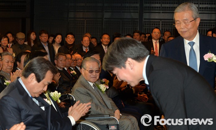 (서울=포커스뉴스) 김종필 전 국무총리가 10일 오후 서울 종로구 세종문화회관 세종홀에서 열린 자신의 정치인생을 담은 '김종필 증언록' 출판기념회에 참석해 정당 대표들의 인사를 바라보고 있다. 왼쪽부터 김무성 새누리당 대표, 김 전 총리, 안철수 국민의당 상임공동대표, 김종인 더불어민주당 비대위 대표.