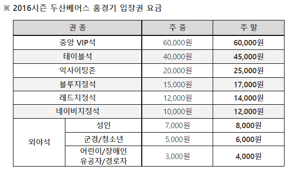 한편 19일과 20일에 열리는 KIA와의 주말 시범경기 홈경기 입장료는 중앙VIP석을 제외한 모든 내야좌석이 5000원, 외야석은 어린이, 장애인, 유공자 및 경로자에 한해 3000원이다. 예매는 14일부터 가능하다. 평일 시범경기는 중앙VIP석을 제외한 전좌석 무료다.프로야구 두산이 10일 2016시즌 홈경기 입장권 가격을 발표했다. 사진은 입장권 요금표. <사진제공=두산 베어스>