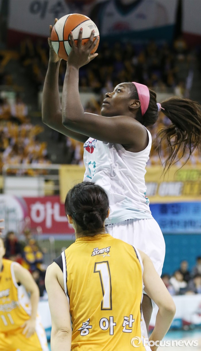(부천=포커스뉴스) 10일 부천체육관에서 열린 2015-2016 여자프로농구 PO 1차전 KEB하나-KB스타즈 경기에서 KEB하나 첼시 리가 KB스타즈 홍아란을 앞에 두고 점프슛을 쏘고 있다.