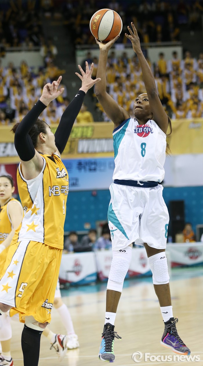 (부천=포커스뉴스) 10일 부천체육관에서 열린 2015-2016 여자프로농구 PO 1차전 KEB하나-KB스타즈 경기에서 KEB하나 버니스 모스비가 KB스타즈 정미란의 블록 위로 미들슛을 쏘고 있다.