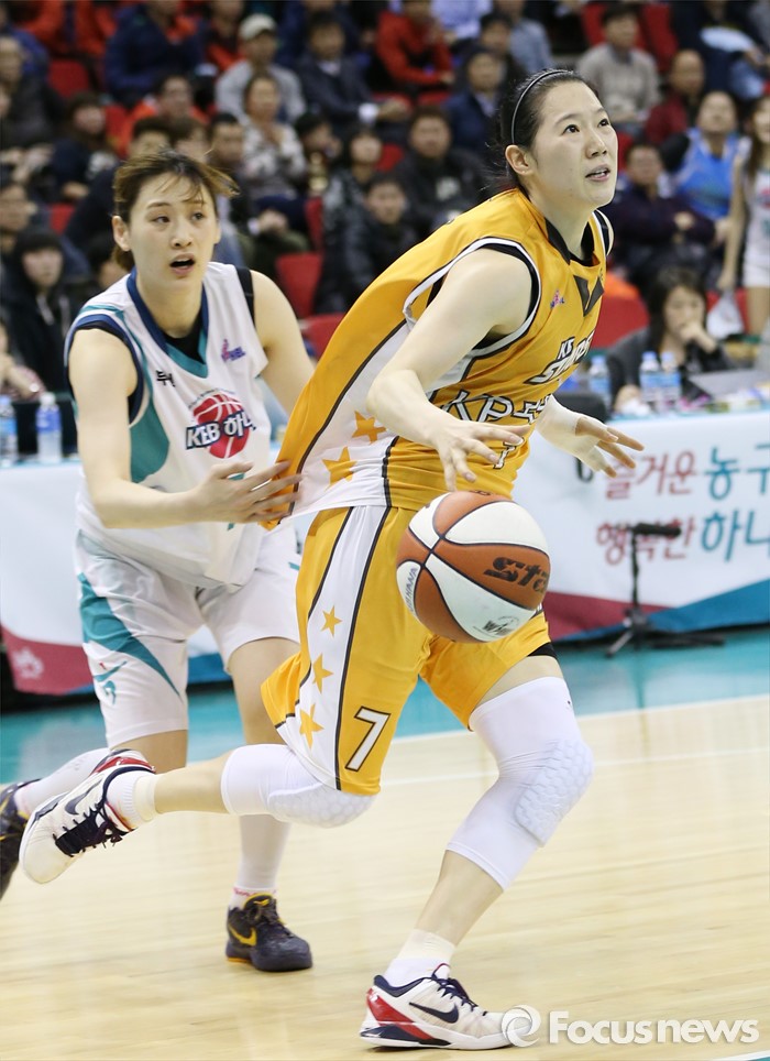 (부천=포커스뉴스) 10일 부천체육관에서 열린 2015-2016 여자프로농구 PO 1차전 KEB하나-KB스타즈 경기에서 KB스타즈 강아정의 대시를 KEB하나 강이슬이 파울로 저지하고 있다.